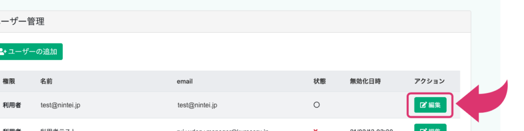 2.編集したいユーザーの「編集」をクリック