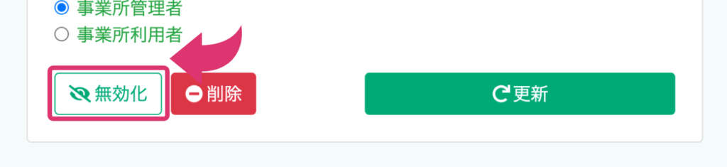 申請者を無効化する 1.「事業所管理」をクリック 2.申請者が所属する事業所の「詳細」をクリック 無効化したい申請者が所属する事業所名の右側にある詳細ボタンをクリックすると、事業所の詳細画面が表示されます。 3. 無効化したい申請者の「編集」をクリック 4. 申請者編集の「無効化」をクリック 最終更新日 2021年8月12日 この記事は役に立ちましたか? はい いいえ 関連記事 申請者情報を削除する 申請者情報を編集する 申請者を登録・追加する 事業所情報を削除する 事業所情報を編集する 事業所を登録・追加する